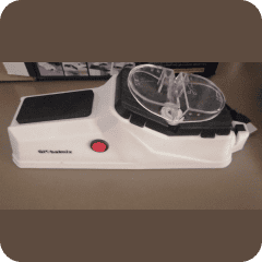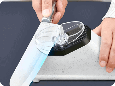 Hogyan kell használni: Helyezd a kést a nyílásba, igazítsd a szögvezetőkhöz, kapcsold be a Razorknife™ elektromos késélezőt, és egyenletes nyomással 2-3 alkalommal húzd át a kést az éles, professzionális él eléréshez.