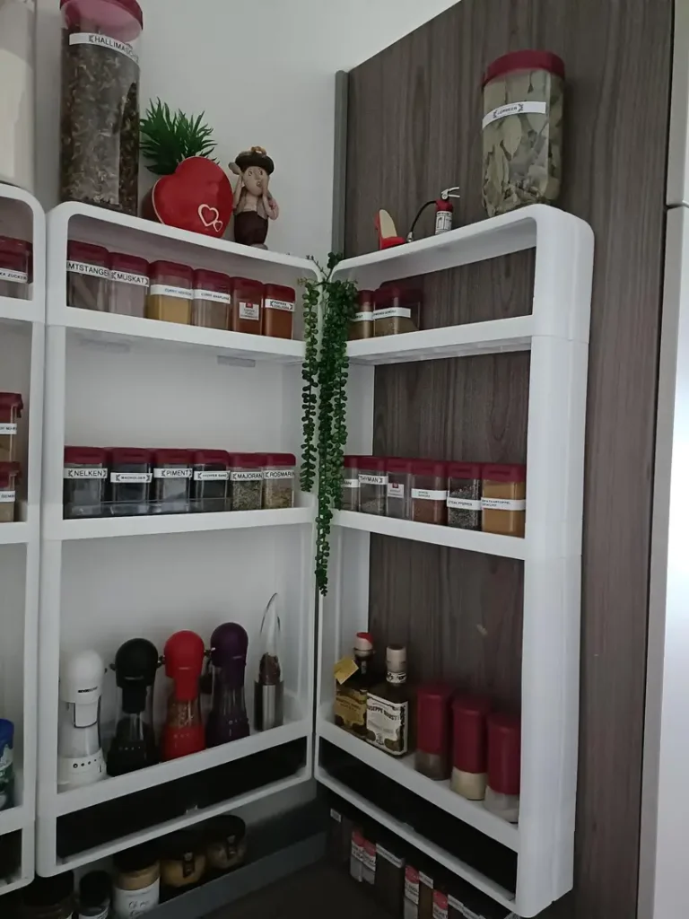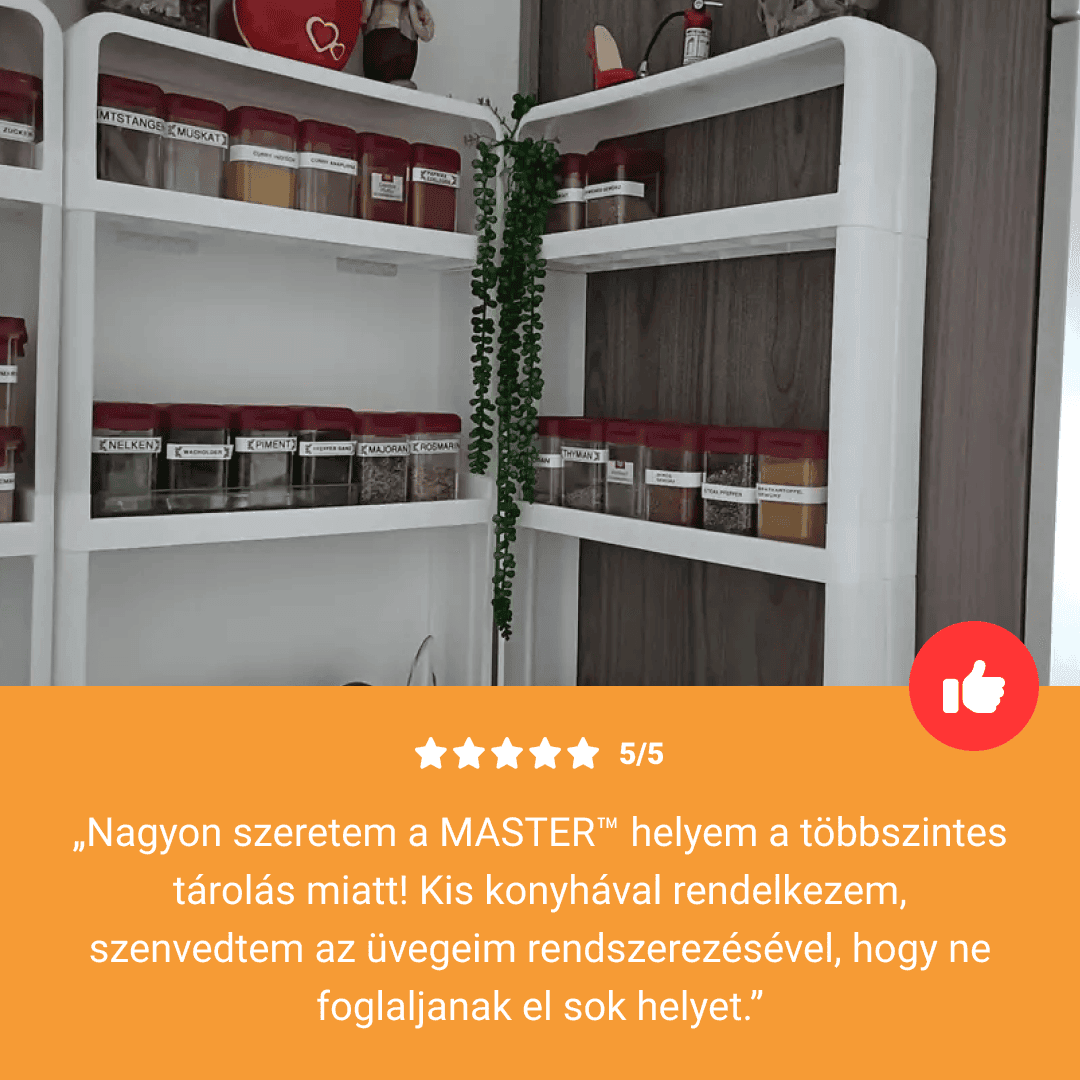 „Tökéletes a konyhám számára, mert a hűtő a főzőlap és a sütő mellett van. Helyet spórolsz az éléskamrában és a fűszerek elérhetőek, illetve könnyen láthatóak. Az állvány nagyon erős.”
