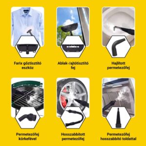 • Teljes Kiegészítő Készlet – 9 fúvókát és eszközt tartalmaz, hogy minden sarkot elérhessen.