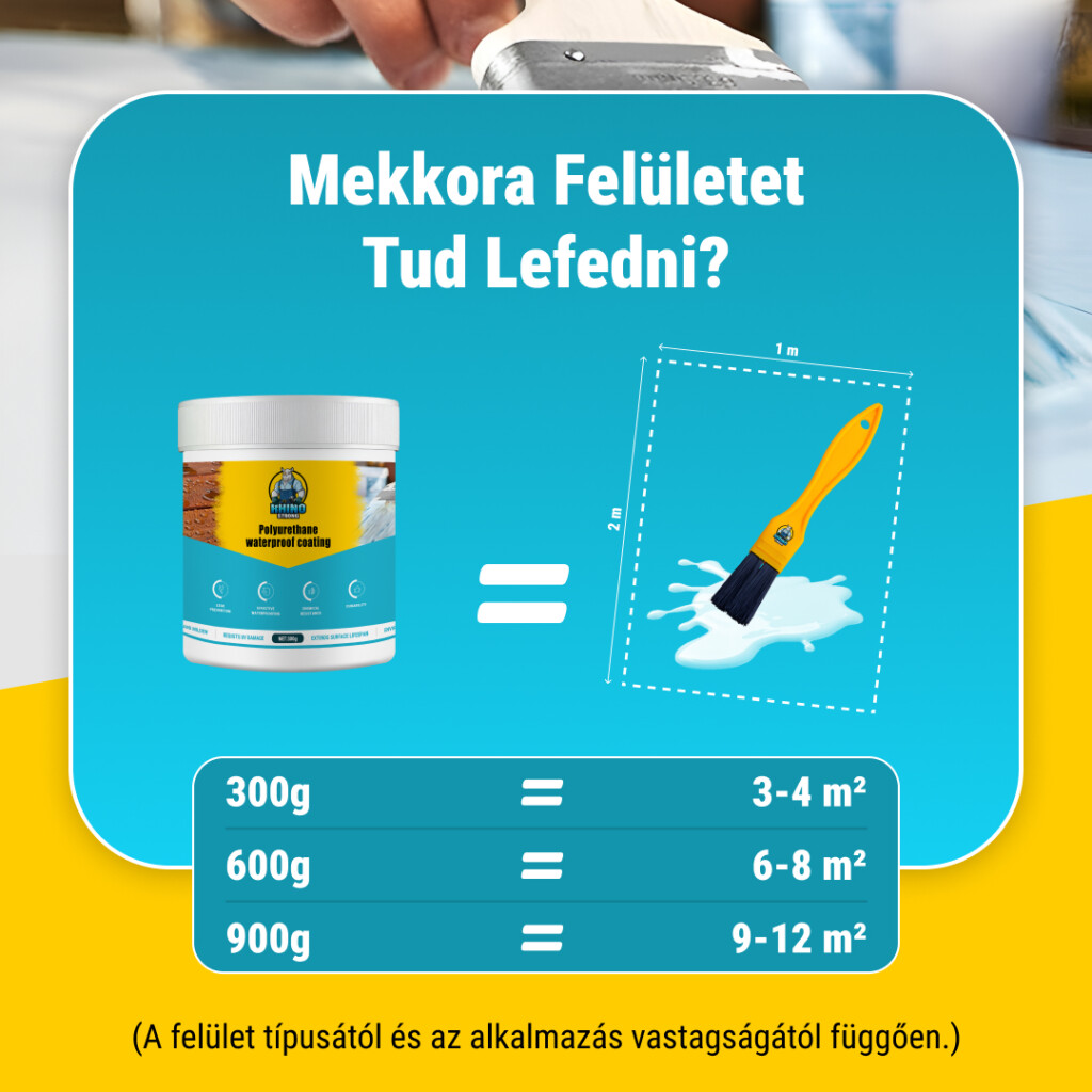 300 g 3-4 m²-t, 600 g 6-8 m²-t, 900 g 9-12 m²-t fed le, a felület és az alkalmazás vastagságától függően.